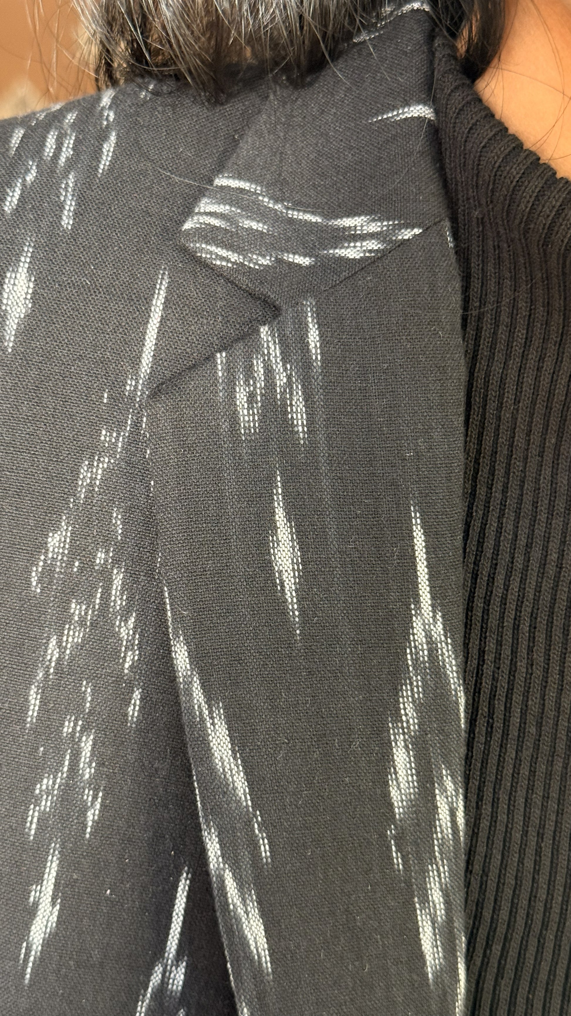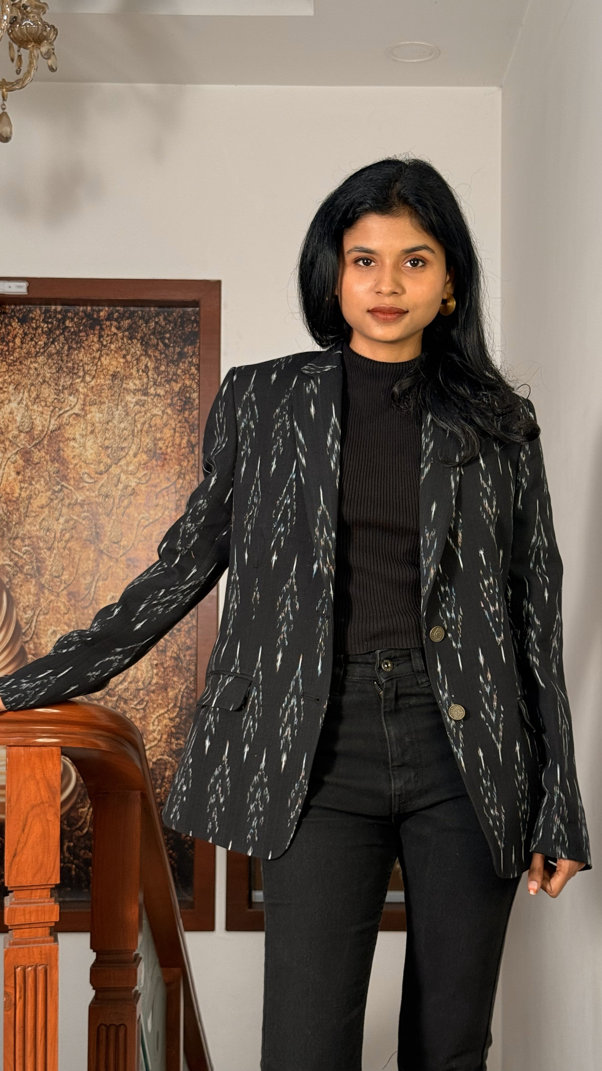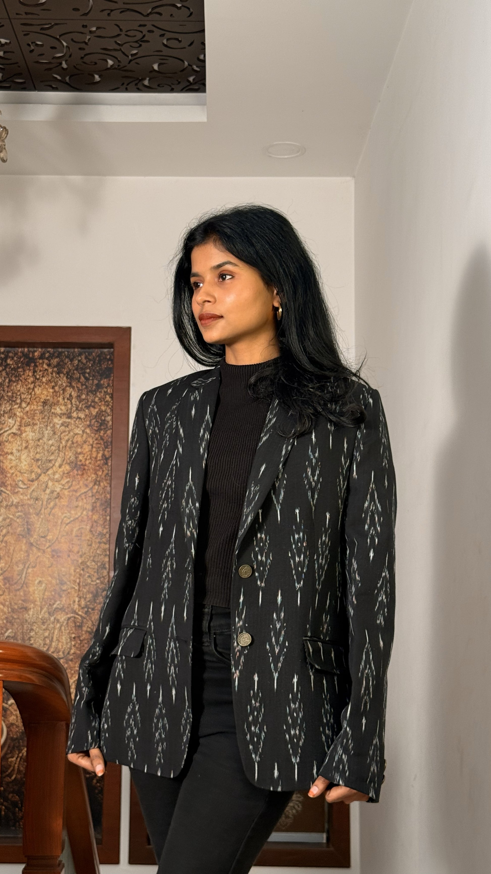 Ein taillierter schwarzer Blazer aus handgewebtem Pochampally-Ikat. Dezente Muster verleihen der zeitlosen Silhouette Tiefe und verbinden traditionelle Handwerkskunst mit moderner Eleganz. Jedes Stück ist ethisch produziert und ein Unikat.