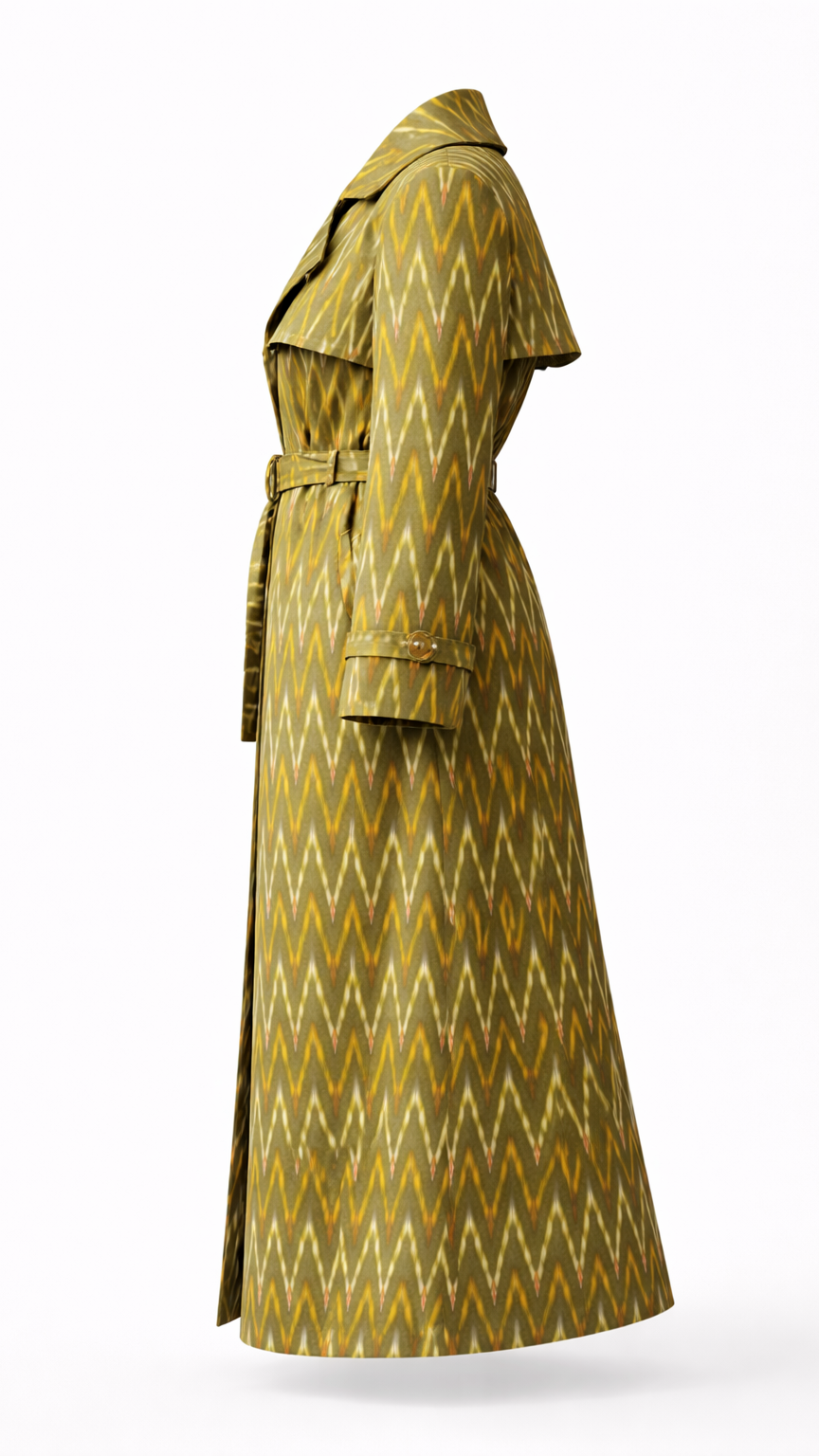 Dieser in Pochampally handgewebte grüne Ikat-Trenchcoat ist eine Hommage an nachhaltige Mode und traditionelle Handwerkskunst. Das kunstvolle Ikat-Gewebe und der strukturierte Trenchcoat-Schnitt vereinen Tradition und moderne Eleganz zu einem zeitlosen Kleidungsstück.